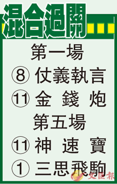 第一場、第五班、一四○○米。「仗義執言」有型有款血統好,怎看都不似五班冇得贏,不排除較遲熟,上次久休復出跑谷中一千米後追一段走勢非常悅目,準備似為此賽而來,開氣之後值得跟進。「金錢炮」六歲馬今季踏入黃金期,對上四戰不勝有位,剛戰更初嚐贏馬滋味,開竅馬大可乘勝追擊