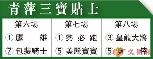 第六場、國際三級賽、一八○○米。「鷹雄」季內三戰雖不上名,不過當中鰤篥y日出爭千四米慶典盃,後上第六表現不俗,只以三馬位不敵廄侶「美麗傳承」;上仗爭香港瓶面對「高地之舞」當難以對峙;至於今晚出爭三級賽一月盃,過往從未跑過窄場,惟有潘頓之助,預料會有優異演出,屆時扒冷門不妨動動腦筋。
