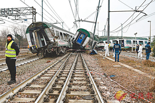 事發於當地時間早上約7時(香港時間下午2時),一列區域火車從克雷莫納市前往米蘭,在距離米蘭車站約40公里處一個轉軌處出事,至少兩卡車廂脫軌。乘客表示,出事一刻感覺火車儼如在碎石上行駛,車身持續搖晃,其後聽到巨響。營運商Trenord發言人指出,火車以正常車速駛近車站,未知脫軌原因。Trenord昨日在twitter發文,指米蘭火車服務延誤是「技術問題造成不便」,遭網民猛烈抨擊。今次是意大利自前年7月以來最嚴重火車意外,當時兩輛高速火車在普利亞大區迎頭相撞,造成23人死亡。 ■路透社/法新社/美聯社