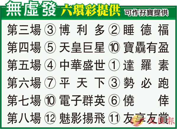 第五場「中華盛世」今季三戰獲兩冠一亞,上場越級挑戰三級賽僅不敵「鷹雄」得第二,但已跑贏今場大部分馬匹,此駒已報跑打m及居於跑馬地百萬挑戰盃前列位置,兩線爭分刻不容緩。「達羅素」歷來六次渡江不勝有位,窄場性能特佳,前駒若有任何閃失便可代之而起。
