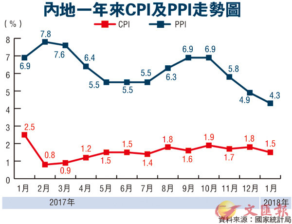 香港文匯報訊(記者 海巖 北京報道)國家統計局昨日發佈的數據顯示,今年1月居民消費價格指數(CPI)同比增長1.5%,連續12個月低於2%,為6個月來最低。當月工業品出廠價格指數(PPI)同比上漲4.3%,漲幅比上月回落0.6個百分點,為14個月以來最低。專家認為,CPI和PPI同比漲幅雙雙收窄,主要都是受去年同期高基數的影響。今年春節與去年錯月,受春節因素影響,專家預計2月CPI漲幅可能明顯擴大,或達全年最高。縱觀全年,CPI平均漲幅可能維持在2%左右,PPI漲幅亦將低於去年。