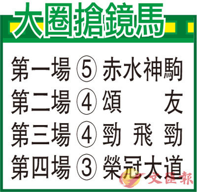 「赤水神駒」助手試兩段,末段自動流順地加速,見越衝越勁餘勢佳,步低揚咬地力充沛,身肌如鐵實,神情專注心火足,狀態依然有上佳水準。