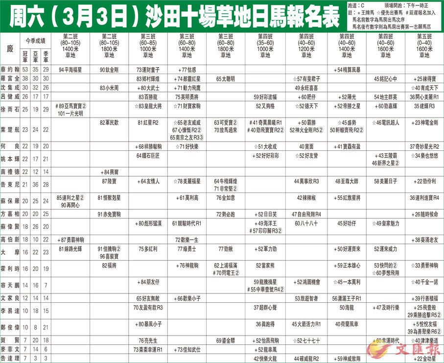周六(3月3日)沙田十場草地日馬報名表