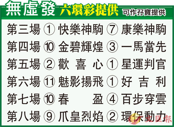 第八場「爪皇烈焰」上季七十分贏馬,上仗同程中段難以穩定走勢,又曾勒避,與梁家俊似不夾檔,今回配兩勝的郭能,霍利時必盡早替此系馬交代。「環保動力」是沙田一哩頭馬,季初同程排劣檔沿途居後,末段追回不少失地,冷要防。