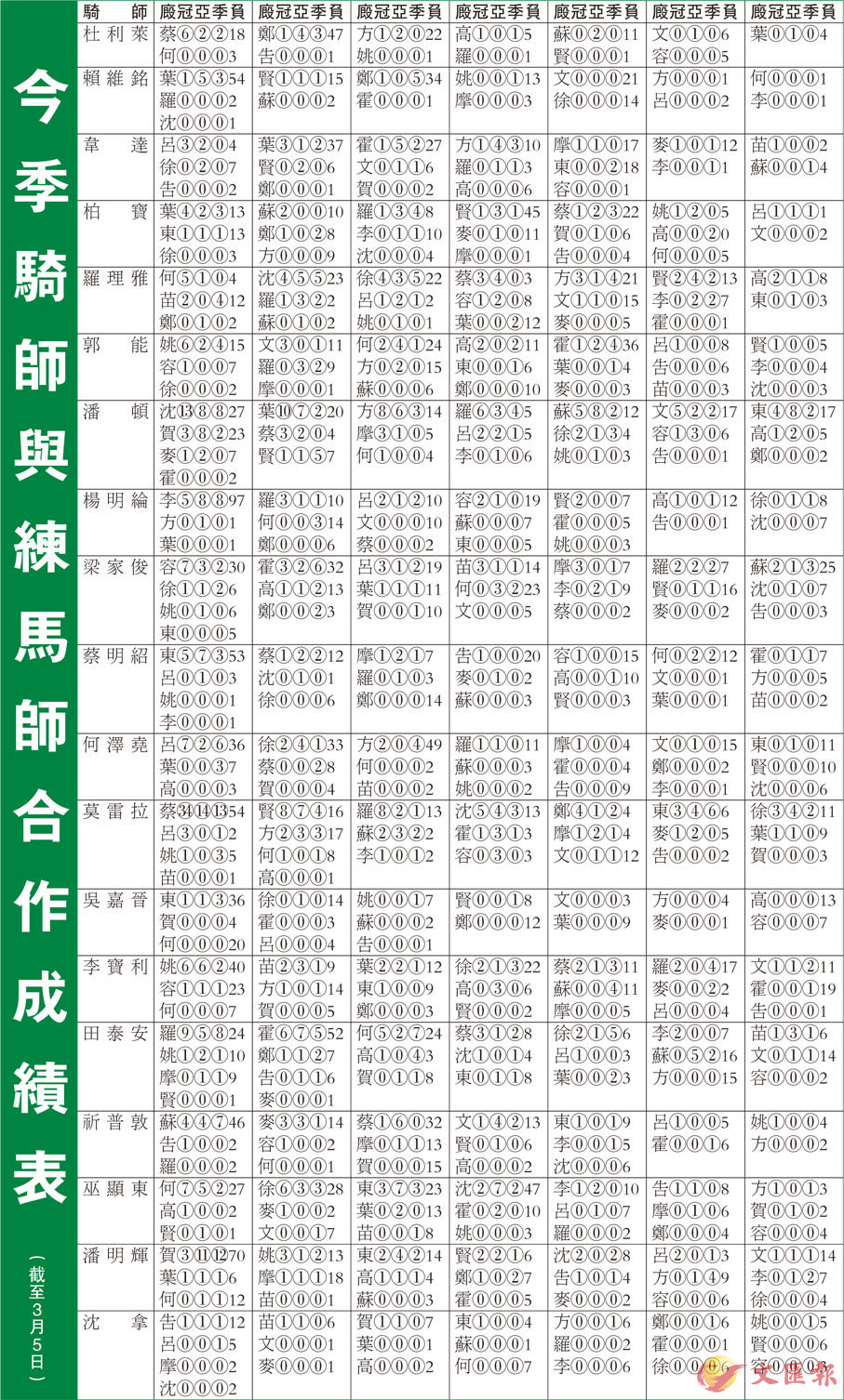 今季至今騎師與練馬師合作成績表
