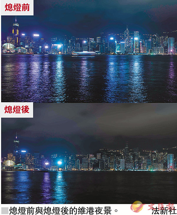 活動昨晚8時半舉行,維港兩岸多幢大廈均有熄燈響應,而「幻彩詠香江」燈光音樂匯演亦暫停。