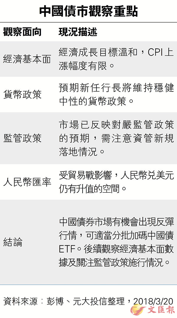 兩會後將出台的《關於規範金融機構資產管理業務的指導意見》簡稱資管新規,元大中國債3-5ETF經理人張勝原表示,資管新規可能對債券市場形成一定壓力,但因為去年債券市場大跌已經反映了大部分監管趨嚴的風險,投資者可以等待政策確定後適當加碼中國債市。