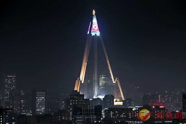 以「世界第一爛尾樓」聞名的朝鮮平壤柳京飯店,昨晚突然亮起璀璨燈光,多盞射燈從酒店低層和中層向高照射,整座三角形建築的頂層部分更影出朝鮮國旗圖案。整個亮燈過程維持不足一小時,但已引起不少駐平壤外國記者關注,令人猜測這座2011年一度復工後又再停擺的105層高樓,今後可能「另有任用」。■法新社