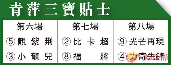 第六場、第三班、一六五○米。「靚紫荊」經常被人忽視之馬,譬如上賽隔晚賠率超過十倍,惟馬兒表現卻貨真價實,排六檔起步慢閘,跟在尾疊跑,轉入直路兜出外疊蝕追跑入一席第二;拚後復課一直操而不戰,今次田泰安放手「放眼量」而揀騎「靚紫荊」爭盃,戰意一層毋庸置疑。