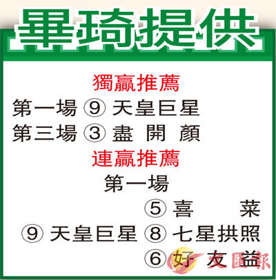 「天皇巨星」助手彭福公園踱一圈,收扣韁約束跟在廄侶馬後操行,主動扯韁越行越好火,出腳低揚勁貫蹄尖,身肌粗壯,毛色鮮潤泛光采,操畢活力十足,狀態已操弗。
