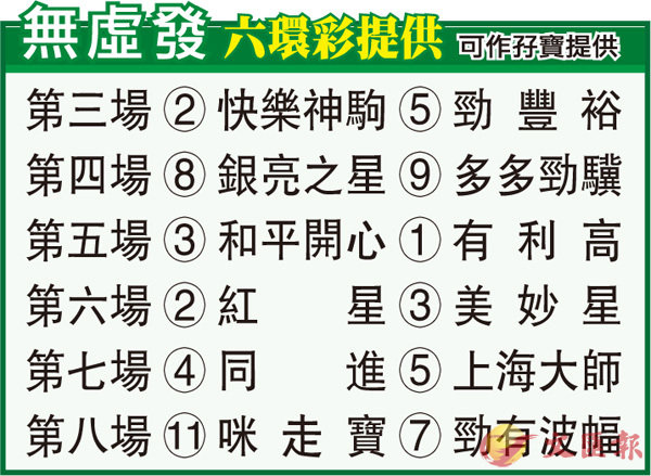 第五場、第四班、一○○○米。「和平開心」上季至今跑了廿四場,今季谷中一千贏兩場,方嘉柏保養值得一讚,上次直路第二段快到廿一秒,老馬搏得就搏可繼續信任。「有利高」來港前後都跑得多,全熟減到五十八分也有多少優勢,突然變身不奇怪。