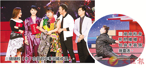 香港文匯報訊 細細粒(陳嘉佳)早前飛往北京參與央視綜藝節目《星光大道》錄影,與內地素人進行演藝PK。節目中,細細粒先後展現唱功、舞功、柔軟度及靈活度,雖然狀態不算太好,但由於表現可愛兼擅於掌握氣氛,結果與另一位內地精英齊齊成為周冠軍!搞笑的是,向來感情豐富的細細粒,當知道自己喜奪周冠軍後,先是露出難以置信及天然呆的表情長達一分鐘,直到站在旁邊的選手提醒,才「如夢初醒」,並一秒爆喊兼激動至口齒不清,令主持們十分意外;其中被細細粒感動至雙眼通紅的女主持人,更大爆細細粒為了做好個SHOW,練歌練至通宵達旦,情景令人十分感動。