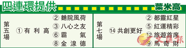 第五場、第四班、一二○○米。「有利高」頗具廄侶「紫雲星」及已退役的「快馬奔馳」的影子,事關呢三匹自購馬來港前在澳洲皆由摩加利訓練,而且外地賽績亦十分接近,推算實力亦相近。「快馬奔馳」上季一落四班立即上名,隨後亦勝出四班賽開齋;「紫雲星」早前亦是贏四班賽開齋反彈;「有利高」上季尾來港但今季才上陣,插入三班評七十二分起步,之後一口氣勤跑連輸六場,減到前次六十分初落四班,立即在田草一千米直路賽跑得第四名;上次轉去谷草一千米再進一步跑第三,可見評分漸有利,今次轉來泥地千二米有權突圍。