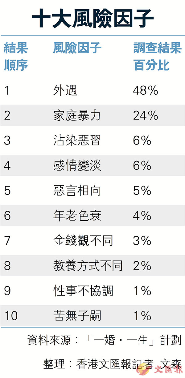 政府的統計顯示,本港每3對夫婦便有 一對會離婚,離婚率不斷上升,「城市青年商會」在今年3月至4月曾進行調查,於將軍澳及銅鑼灣街頭及網上訪問1,200名市民,要求他們從「十大離婚風險因子」中選出個人認為會對婚姻造成最大威脅的一個,發現48%受訪者都選擇「外遇」。
