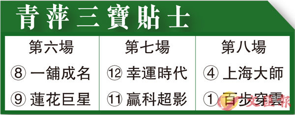 第八場、第三班、一二○○米。「上海大師」近三場改攻谷草同程取得一冠一季,當中前仗擊敗「喜進」逾一個馬位,姿態頗為出色,四歲自購馬經已搵到谷草新出路;自上仗配雷神搏失,復課後操練仍十分積極,有打翻身仗意圖,晨課復由何澤堯一手考驗;今次排十二檔實有錢分,隨時施回馬槍。