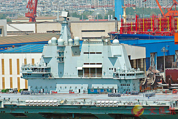 昨日,國產航母頂板雷達開啟,大批海軍工程人員在甲板集結。自本月4日起,航母加強警戒,登艦懸梯口處已有哨兵晝夜執勤。89號綜合保障船8日還掛出代表「B」的海事信號旗,意為「裝卸危險貨物」,被外界解讀為正在加注燃油。海試環節中,保障船一般會先於航母離港出海。■文/圖:香港文匯報記者 宋偉 遼寧報道