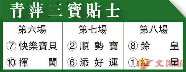 第七場、第二班、一二○○米。「順勢寶」來港已三季,在賽事中一再得到驗證,性能乃正宗谷草短爆型後上馬,無論快慢步速,鰝螂蘅`會交到一段強悍變速力,只要遇琝庤捸A決不容易有對手可予抵擋牠的後勁,今次相隔上場只有十幾日時間,由田草一千回師窄場千二米強項,配李寶利排靚位起步,當屬半冷門之選。