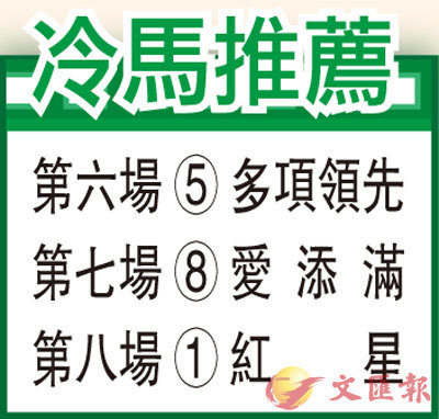 第八場、第三班、一二○○米。葉楚航馬房的「紅星」,配上潘頓夾慣夾熟,上次只因檔位際遇不佳,早段留得較後,加上當晚場地大利放頭及前置而不利後上,結果「紅星」都後上跑得接近的第四名,但細心一看潘頓的動作,他入正直路知道馬匹取勝機會較低,末段輕鞭之下似留有以待,落敗賽績未可作全準,今次排個不俗的六檔,交出合理水準的話,有權在此跑入前列。