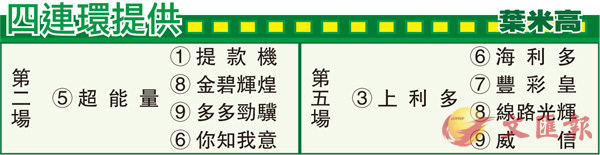 第五場、第二班、一八○○米。環顧今場參戰馬當中,「哈蝦巴爸」及「上利多」剛於月初國際三級賽皇太后盃二千四百米大敗於「時時精綵」獲得二、三名,「哈蝦巴爸」當時末段明顯轉弱,仍憑鬥心力拒「上利多」,估計耗力甚多,今次相隔兩周半再來,「哈蝦巴爸」體力方面不無疑問;「上利多」在港廿二戰僅一勝,全季最接近是谷中此程,當時負一二三磅不敵一一三磅的「比卡超」及一一九磅的「達羅素」獲季軍,如今比「比卡超」高七分,結合季內拚搏不多及季尾狀態及時復甦,有望贏番場。
