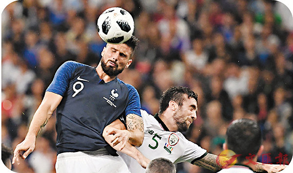 ■基奧特(左)昨凌晨熱身賽頂入一球,追平施丹的31個法國隊入球紀錄並列隊史第4,助法足主場贏愛爾蘭2:0。 法新社