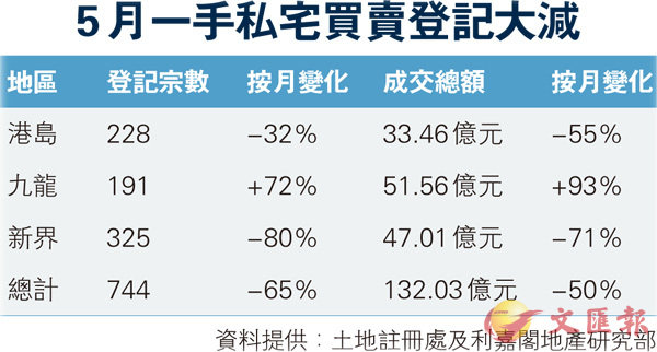 香港文匯報訊 受到樓價高、全新大盤推出少等因素影響。據地產代理統計,5月全港共錄744宗一手私人住宅買賣登記,登記總值132.03億元,較4月分別大跌65%及50%。當中,登記量為近16個月次低水平。