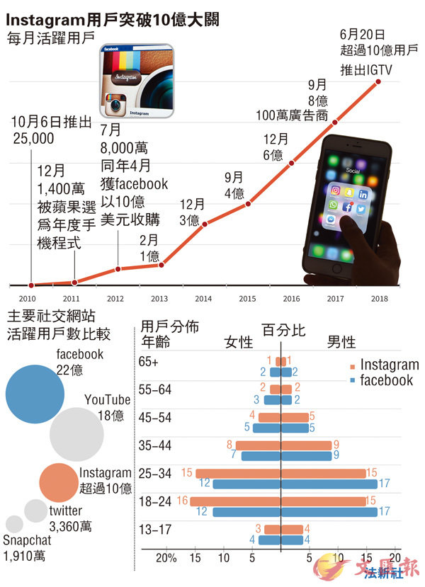 網上視頻平台競爭白熱化,相片分享平台Instagram也來加入戰場,前日推出全新IGTV應用程式(app),讓用家可以在手機分享和觀看最長達60分鐘的垂直拍攝影片,被指是要與YouTube搶客,特別是一些本身已經頻繁地使用ig、粉絲人數動輒過千萬的超級網紅。IGTV的iOS和Android版本即日起上架。