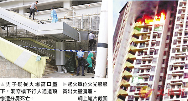 昨日清晨5時18分,上址單位突然冒煙起火,火光熊熊,有街坊見狀立即報警及自行疏散。消防員到場約半小時將火救熄,惟單位已嚴重焚毀,更發現一名男子倒臥對落樓下的行人通道梯級,身軀斷成多截,而通道頂的鋅板亦被洞穿,不排除有人由火場單位逃生時墮樓釀成慘劇。