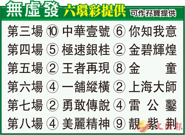 第五場姚廄「王者再現」早前在同程贏得清脆,上次縮程跑一哩表現仍有兩腳,越戰越勇馬今次回師勝途上陣又可再顯威力,當要優先留意。「金童」今季養回健康終見威力,打疊五場不勝有位越戰越銳,演出準繩馬回配沈拿未可忽視。