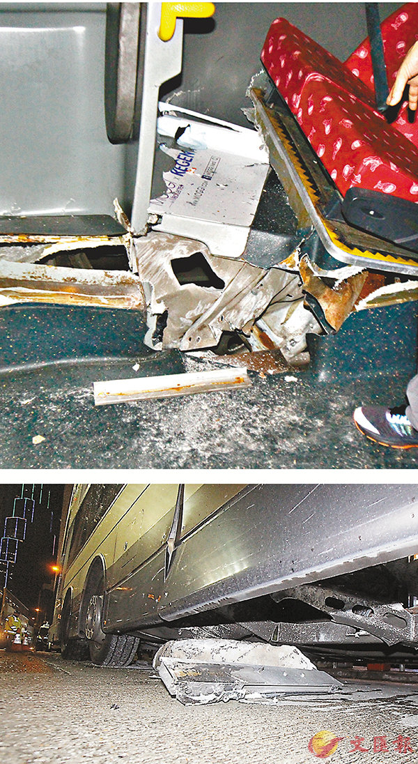 一輛往來粉嶺華明至灣仔北978號九巴,昨晚8時許駛經中環德輔道中近利源東街時,疑上址路陷有石屎凸起,九巴駛經車底應聲被凸起石屎撞穿,下層樓梯及一排關愛座同告損牷A車上兩男女乘客受傷,車長報警,兩名傷者由救護車送院治理。