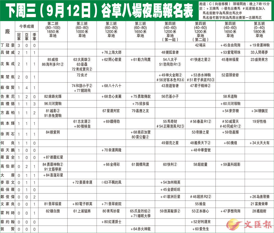 下周三(9月12日)谷草八場夜馬報名表