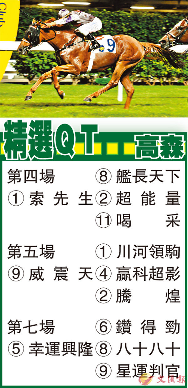 第五場、第四班、一六五○米。「威震天」六歲美國馬上季演出漸趨穩定,獲得兩冠兩季佳績,該兩場頭馬俱是自造偏快步速放返,屬高難度動作,經暑期儲足體力兼注滿新鮮感,可故技重施一放絕塵。「贏科超影」剛季在四班此程叩響勝鼓,而今減夠分重返四班,首戰即用王牌瞄準勝途來意不善,已要留意。