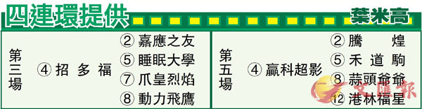 第五場、第四班、一六五○米。高伯新馬房的「贏科超影」,來港兩個馬季合共十六戰,獲得冠季軍各一,翻看贏馬一役於上季在第四班評五十八分,當時後上勝出谷草一哩爆冷開齋,其時負一二九磅在好快地下造出一分三十九秒七九的佳速,水準頗高,贏馬後升上三班五戰皆乏作為,今季遂回降四班角逐。「贏科超影」馬仔細細,但鬥心強悍兼走位靈活,可見谷戰特佳,今季此駒重返四班可以講係惡氣縱橫,復課至今狀態進度十分理想,看幕後動態有急攻決心,初出即跑谷草勝途可以捧場,宜加以留神。