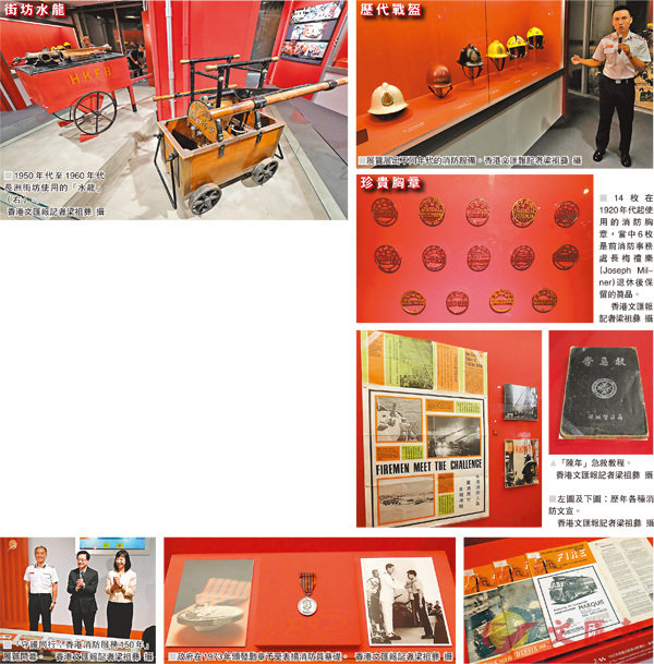 香港文匯報訊(記者 岑志剛)今年是香港消防服務成立150周年,消防處聯同歷史博物館舉行「守護同行--消防服務150周年」展覽,展出早期的消防設備和工具,包括木製消防車、街坊水龍和行動頭盔,更首次展出6枚1920年代消防員職級黃銅胸章真品(俗稱荷蘭水蓋),彌足珍貴。