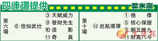 第十場、第二班、一二○○米。「巡航導彈」上季B布自購馬在南澳洲跑四場,得兩冠一季,在萬富圍馬場贏過兩場,雖然南澳洲的賽事平均水準較低,但能夠在當地贏短途的自購馬,來港後普遍都有不俗成績。「巡航導彈」身形魁梧,體重逾千二磅,前胸肌肉健碩具備成為短途良駒的條件,上季在港初出已幾乎贏,只輸鼻位屈居亞軍;翌仗嶺娃S亦能大勝兩個半馬位;目前評八十二分,保守估計今季至少贏兩場,八月開操至今力磨不懈,是容廄搶攻分子。
