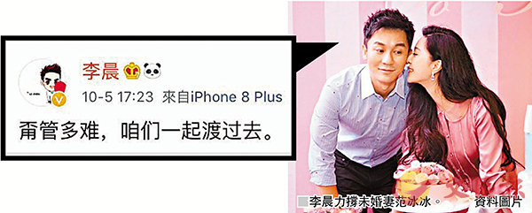 香港文匯報訊(記者 張美婷)范冰冰因涉及逃稅風波而消失了百多天,日前終在社交平台上傳致歉信,坦認逃稅一事。可是其未婚夫李晨卻一直低調,亦一直沒對外發言。坊間的聲音不斷,更令不少人懷疑二人感情有變,一度傳出李晨大難臨頭各自飛拋棄范冰冰的說法。昨日下午,李晨終在社交平台上發佈一則留言力撐未婚妻范冰冰。