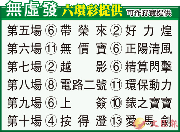 第六場「無價寶」上賽於千二米跑得亞軍,若非起步包尾兼直路頭段曾經塞車,料頭馬已手到拿來,磨利再臨有力贏馬建功而回。「正陽清風」上季兩戰俱跑第三,顯有一定潛力,今季轉四歲操好先至上征途可期贏馬添進帳。