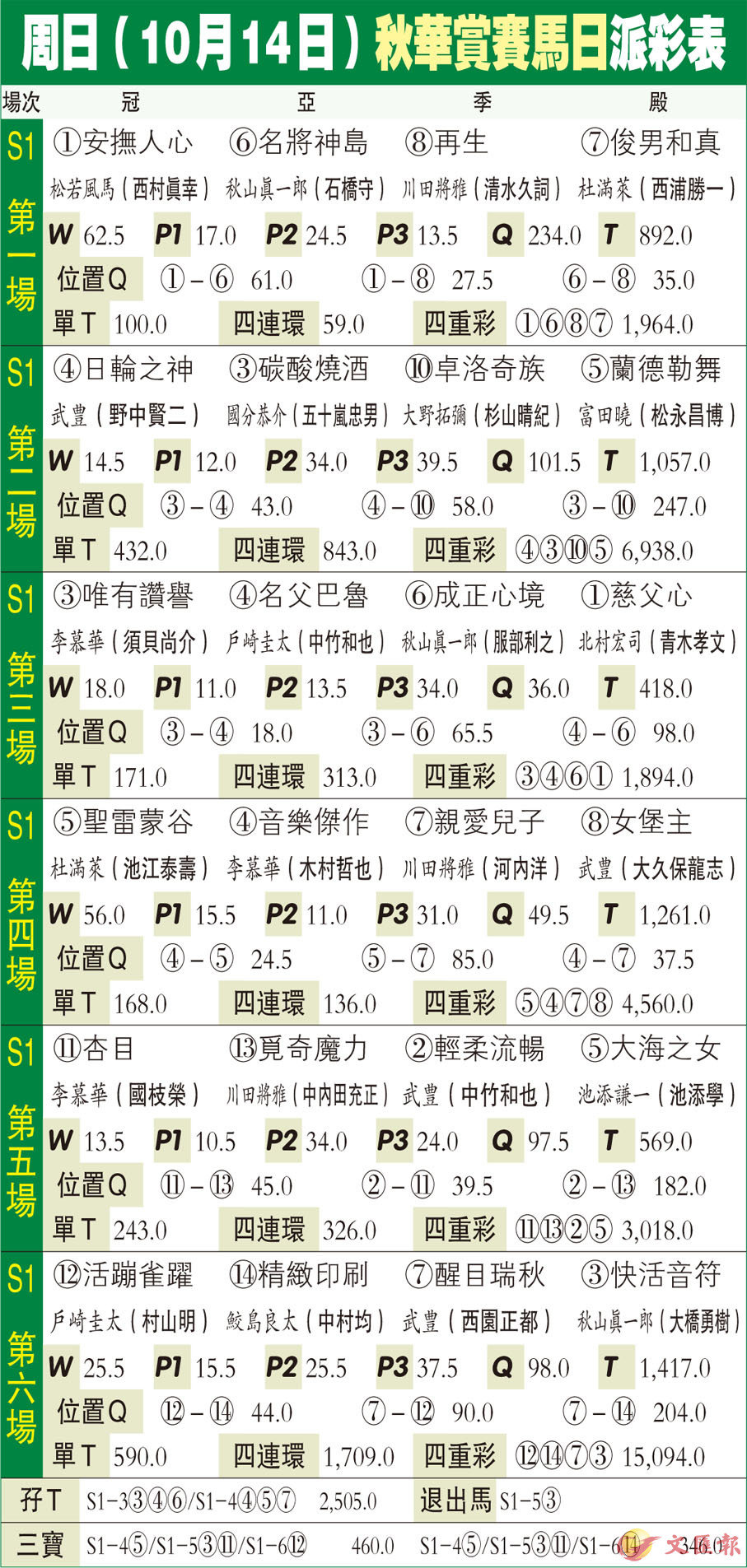 周日(10月14日)秋華賞賽馬日派彩表