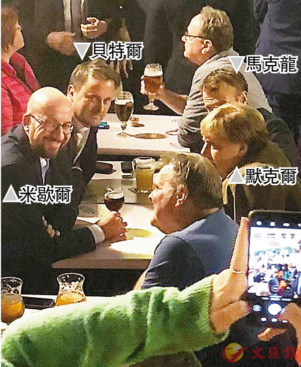 歐盟峰會討論英國脫歐問題未有結果,德國總理默克爾、法國總統馬克龍、盧森堡首相貝特爾和比利時首相米歇爾前晚晚宴後,私下到一間酒吧小酌。據報馬克龍當時原本獨自在布魯塞爾街上散步,突然接到貝特爾訊息,叫他「來加入我們」,到酒吧發現其他人已在。4名領導人光臨吸引不少民眾圍觀拍照,更有人即場問及談判進度,不過默克爾的回應相當風趣:「拜託,這是一個美好的夜晚,請不要破壞她。」貝特爾則透露最終這晚是由他埋單,以慶祝他的政黨勝出國會選舉。 ■綜合報道