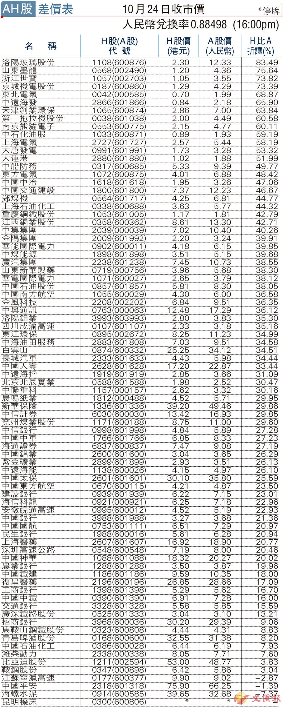 AH股差價表