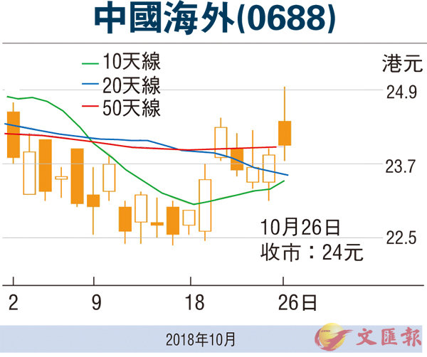 港股維持尋底走勢,觀乎中資股則以個別發展為主,當中中海油第三季油氣銷售收入按年升33%,並獲大摩唱好,刺激股價一度走高至13.64元,收報13.4元,仍升0.22元或1.67%。另一方面,內房股也是昨日淡市下的焦點所在,萬科(2202)第三季純利48.61億元人民幣,增8.3%勝預期,股價一度搶上24.95元,最後則回順至23.7元報收,仍升0.45元或1.94%。