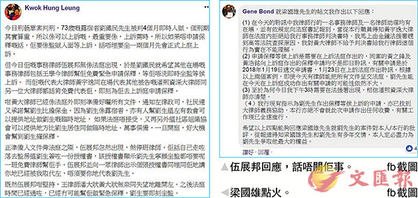 伍展邦其後回應長毛的帖文,話申請保釋等候上訴需要在上訴法庭作出,「同案的黃之鋒及黃浩銘向上訴庭作出的保釋申請均不是即日聆訊,......即使今(前)天有律師能把所有文件呈交法庭,劉先生能在今(前)天在上訴庭成功作出有關申請的可能性依然不大。」
