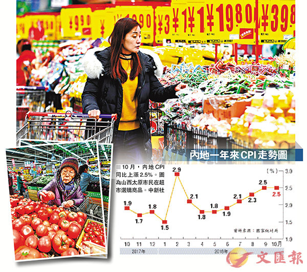 香港文匯報訊(記者 海巖 北京報道)國家統計局昨日發佈的數據顯示,在食品價格漲幅回落的影響下,10月中國居民消費價格指數(CPI)同比增長2.5%,與9月持平,結束連續四個月上漲趨勢。當月工業生產者出廠價格指數(PPI)同比上漲3.3%,連續四個月收窄。經濟學家指出,數據顯示當前通脹平穩,整體物價上漲動力不足,但工業生產需求不旺,工業企業成本壓力較大,未來或影響盈利水平。