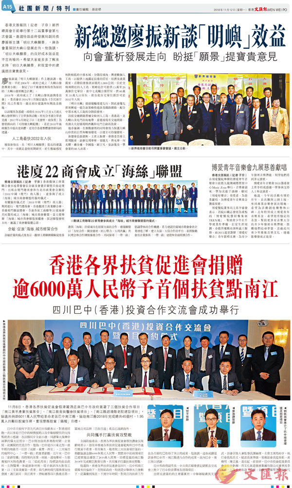 11月8日,香港各界扶貧促進會假港麗酒店與巴中市政府簽署了三個扶貧合作項目:「南江黃羊產業扶貧基金」、「南江教育與醫療扶貧項目」、「南江縣趕場敬老院建設項目」,協議共捐款6011萬人民幣給革命老區巴中南江縣,協助南江縣2018年完成總共45個村、1.95萬人的艱巨脫貧任務,實現整縣脫貧「摘帽」目標。