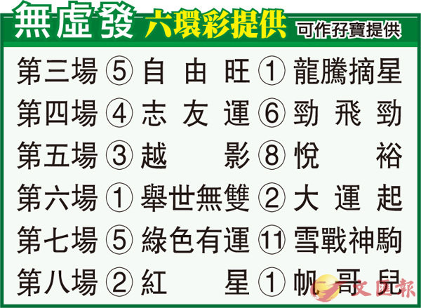 第三場「自由旺」近仗一放了事走勢似乎留有以待,今次抽到一檔起步對其快放跑法有利,估計目標應放在今場。「龍騰摘星」轉投苗廄後翌仗已在谷草千二米贏馬,睇其姿態根本是有餘未盡,今次沿留四班再戰勝途,苗禮德有力再省招牌。