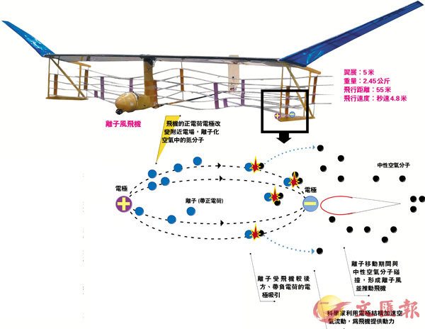 自從萊特兄弟於1903年發明史上首架動力飛機後,飛機設計始終都離不開螺旋槳或渦輪葉片,但來到105年後,人類飛行技術終於出現新突破。美國麻省理工學院(MIT)工程師前日於《自然》期刊發表報告,宣佈成功開發不用螺旋槳、渦輪葉片等推進裝置,僅以「離子風」(ion wind)推動的小型飛機,並已完成11次室內試飛。專家表示新技術短期內有望應用於製作接近無聲的無人機,長遠則可望大幅減低航空界溫室氣體排放量。