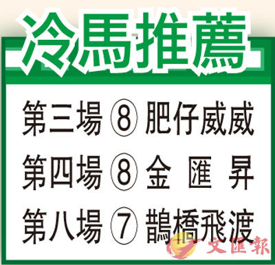 第三場、第四班、一二○○米。「肥仔威威」出自「賭場王子」,該駒曾五捷千一至千六米,包括一級賽諾頓錦標,並曾來港角逐冠軍一哩賽。在港子嗣如「大笑大少」及已退役的「辣得很」等駒,普遍擅短途。「肥仔威威」的同母馬中,名氣最響是「信心成事」,該駒在澳洲五捷短途至千四,包括二級賽,料「肥仔威威」會如其兄長一樣擅短途,熱身後提防一步到位。