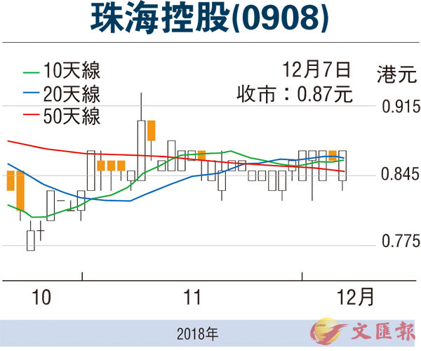 珠控上周五收報0.87元(港元,下同),微升1仙。現價往績市盈率17.7倍,但市賬率(PB)只有0.56倍,市值只有12.4億元。這次與母公司資產置換有利提升資產價值及融資能力,提升信用評級,有利改善股價長期大偏低局面。控股公司及非執董近月頻在市場增持,股價大折讓成賣點,投資者不妨小注趁低收集,中線上望1元水平。