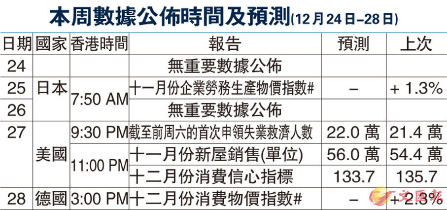 本周數據公佈時間及預測(12月24日-28日)