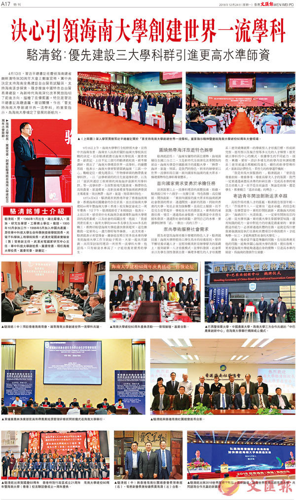 9月15日上午,海南大學舉行全校幹部大會,宣佈中共海南省委、海南省人民政府關於海南大學校長任職的決定,任命駱清銘擔任海南大學校長,黨委常委、副書記。上任不足三個月的駱清銘校長,經考察調研,提出了「海南大學建設世界一流學科」的總體思路。他表示,海南大學要緊密圍繞海南「三區一中心」戰略定位,優先建設以「作物學牽頭的熱帶農業學科群」、以「法學牽頭的的文化旅遊學科群」以及以「資訊與通信工程牽頭的南海海洋資源利用學科群」等一流學科群,全面對接現代服務業、熱帶特色高效農業、旅遊產業、高新技術產業等海南經濟發展主導產業,突出熱帶、海洋、旅遊、特區學科特色。