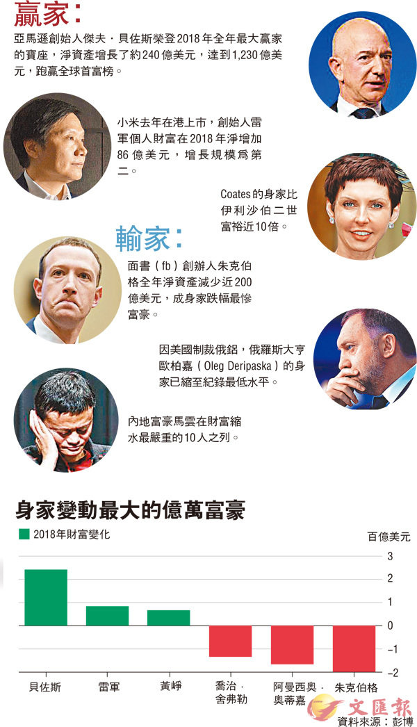 去年環球金融市場不景氣,全球股市縮水12萬億美元(93.6萬億港元),縮水幅度是金融危機以來最大,也是歷史上第二大紀錄,不少億萬富豪身家大縮水,但也不妨礙一些新經濟企業創始人收穫財富。據彭博報道,亞馬遜創始人傑夫•貝佐斯(Jeff Bezos)連續第二年成為「最大贏家」,其淨資產在2018年增長了約240億美元,達到1,230億美元,跑贏全球首富榜。大輸家則是面書(fb)的創辦人朱克伯格(Mark Zuckerberg),身家縮水近200億美元。 ■香港文匯報記者 周曉菁
